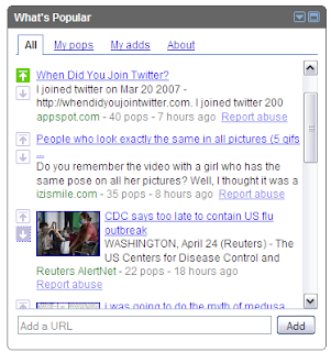 Google has just launched a new gadget for iGoogle called What's Popular that aims to compete with, if not destroy, Digg. Though just a gadget for now, it's not like it would be a lot of work for Google to spin it into a Google labs service for those with a Google Account. It basically does the same thing: Submitted links and pages, rankings, + algorithm = awesome.What's interesting to me is if this does truly offer the same services as Digg, with Google eventually adding some kind of badge or bookmarklet to "WP" something (like Digg-ing it) then with the superior web skills, bigger reach, internationality and languages, and huge financial opportunity by monetizing through AdSense-- how could Digg survive?